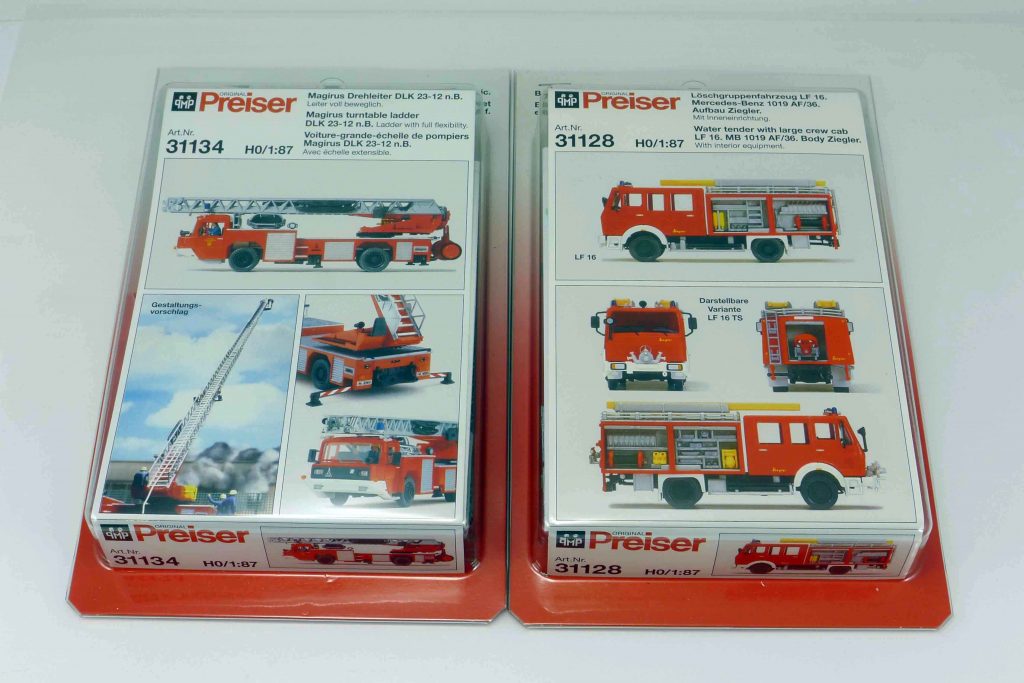 Die beiden Feuerwehrmodelle gehören mit zu den ersten Bausätzen, die Preiser um 1983 auf den Markt brachte. Es handelt sich um das Mercedes 1019 AF/36 LF 16 und die Magirus Drehleiter DLK 23-12 niedere Bauart. Vor allem die Drehleiter war damals eine Sensation und verkaufte sich wie geschnittenes Brot. Das Besondere am Mercedes Löschfahrzeug LF 16 war, dass die Ausstattung des Aufbaus komplett mit offenen Rollläden nachgebildet werden konnte. Das gab es bis dahin noch nicht. Etwas später lieferte der Modellbahnfiguren-Hersteller aus dem fränkischen Steinsfeld Miniaturen des Magirus Eckhaubers, nicht nur als Einsatzfahrzeuge, sondern auch als Baufahrzeuge mit Dreiseitenkipp-Pritsche und Steinmulde. Es ist müßig zu erwähnen, dass Preiser seine Modelle bis ins kleinste Detail dem Vorbild nachgezeichnet hat. Und es musste nichts lackiert werden.