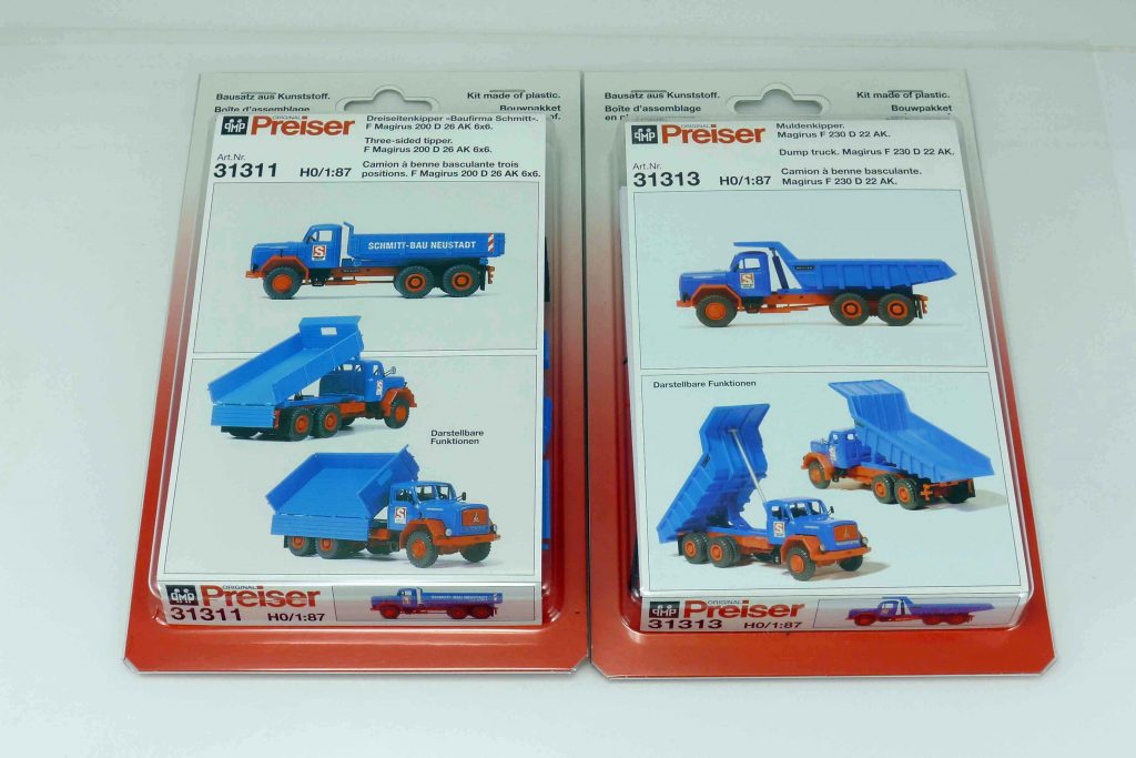 Preiser 31128 Mercedes 1019 AF/36 LF 16. FH und Aufbau rot. FG schwarz. Kotflügel weiß. Kunststoffbausatz. UVP 29,99 €. 31134 Magirus Drehleiter DLK 23-12 n. B. FH und Aufbau rot. FG schwarz. Leiterpark silbern. Kunststoffbausatz. UVP 49,99 €. 31311 Magirus F 230 D26 AK 6×6 mit Dreiseitenkipper „Schmidt-Bau Neustadt. FH und Kippaufbau blau. FG rot. 31313 dito F 230 D22 AK mit Steinmulde. Kunststoffbausätze. UVP jeweils 29,99 €.