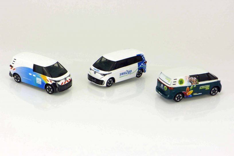 Unter der Bezeichnung „swu2go“ bieten die Stadtwerke Ulm/Neu-Ulm den Bürgern der Donaustädte ein Car-Sharing-Angebot mit Elektroautos. Die Fahrzeuge sind auf viele Standorte in den Städten verteilt. Der von Rietze miniaturisierte ID.Buzz ist das neueste Mitglied im swu2go-Fuhrpark. Stationiert ist das Fahrzeug unweit der Ulmer Innenstadt, direkt am SWU-Hauptgebäude in der Wilhelmsstraße.