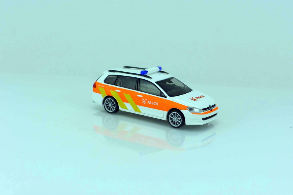 Weiter geht es mit den Modellen, die auf dem Bach mit Blaulichtern bestückt sind. Rietze miniaturisiert erneut ein Einsatzfahrzeug der Hilfsorganisation Falck in Hamburg. Diese betreibt dort neun Rettungswachen mit mehr als 550 Mitarbeitenden. Der VW Golf 7 Variant stellt einen Kommandowagen dar, der dem Führungsdienst des neu eingerichteten Katastrophenschutzes von Falck zugeordnet ist. Sein Kennzeichen lautet HH-FR 702.