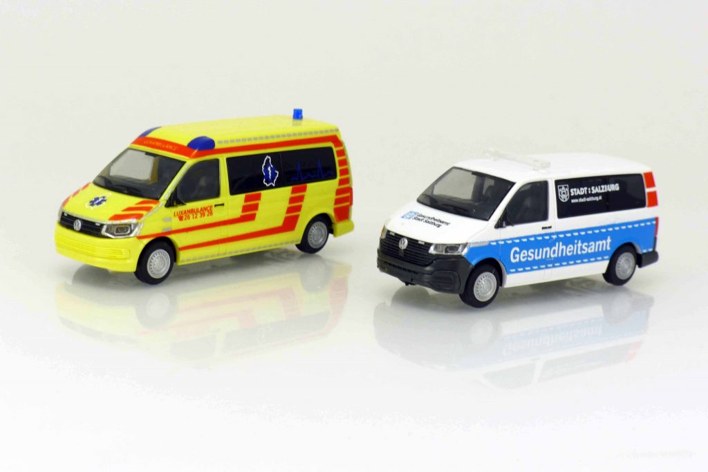 Rietze 53331 VW Golf 7 Variant Kommandowagen „Falck Rettungsdienst Hamburg“. Karosserie weiß mit leuchtroter Bauchbinde. Dachbalken mit blautransparenten Warnleuchten. Beiliegende Seitenspiegel. UVP 24,90 €. 53921 VW T6.1 Bus „Gesundheitsamt Stadt Salzburg“. Karosserie weiß mit blauer Bauchbinde. Ein transparenter Dachbalken. UVP 24,90 €. 53775 VW T6 LR RTW „Luxambulance“. Karosserie gelb mit roten Streifen. Drei blautransparente Warnleuchten. UVP 25,90. Jeweils beiliegende Seitenspiegel. 51408 Einsatz-Serie 1:87 VW ID.Buzz Cargo RTW „DLRG Quakenbrück i. Artland“. Karosserie weiß mit roter Bauchbinde. Ein blautransparenter Dachbalken und ein Warnlicht. Kennzeichen „OS Q 1923E“ UVP 27,90 €.