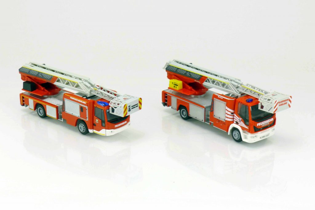 Rietze 68591 Magirus Feuerwehr DLK 32 ’18 „Feuerwehr Koblenz“. FH, Aufbau und Leiterstuhl rot. Rollläden und Riffelblech chromsilbern. Leiterpark hellgrau. Zwei blautransparente Warnleuchten. 71117 Magirus DLK 32 n.B. „Feuerwehr Mindelheim“. Farben wie zuvor. Jeweils beiliegende Zurüstteile. UVP jeweils 39,90 €.