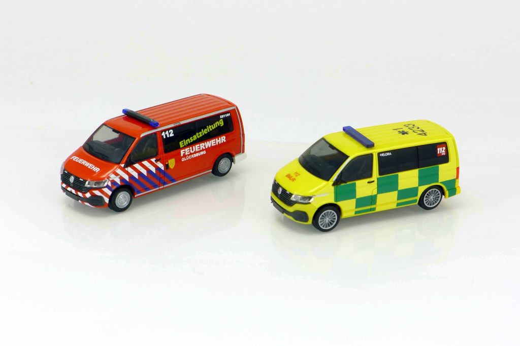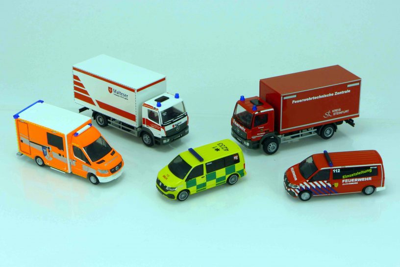 Rietze 53964 VW T6.1 Kombi kurzer Radstand „SMUR 112“. Karosserie gelb mit grünem Battenberg-Design. Ein transparenter Blaulichtbalken. Dachkennung „*1 4233“. UVP 24,90 € 53953 VW T6.1 Kombi langer Radstand „Feuerwehr Glücksburg Einsatzleitung“. Karosserie rot. Dachbalken mit zwei blautransparenten Warnleuchten. UVP 25,90 €. 76286 Mercedes Sprinter WAS-Design-RTW `18 „Feuerwehr Oberhausen“. FH und Aufbau leuchtrot lackiert, Aufbaudach weiß. Blaulichtbalken mit zwei blautransparenten Warnleuchten und heckseitige blautransparente Leiste, UVP 29,90 €. Jeweils beiliegende Seitenspiegel. 72516 Mercedes Atego Koffer-LKW „Malteser Darmstadt / GW-L“ 2016. FH und Kofferaufbau weiß. Zwei blautransparente Warnleuchten. 72515 dito „Feuerwehrtechnische Zentrale Kreis Steinfurt / GW-L“ 2015. FH und Kofferaufbau rot. Jeweils beiliegende Seitenspiegel. UVP jeweils 19,90 €.