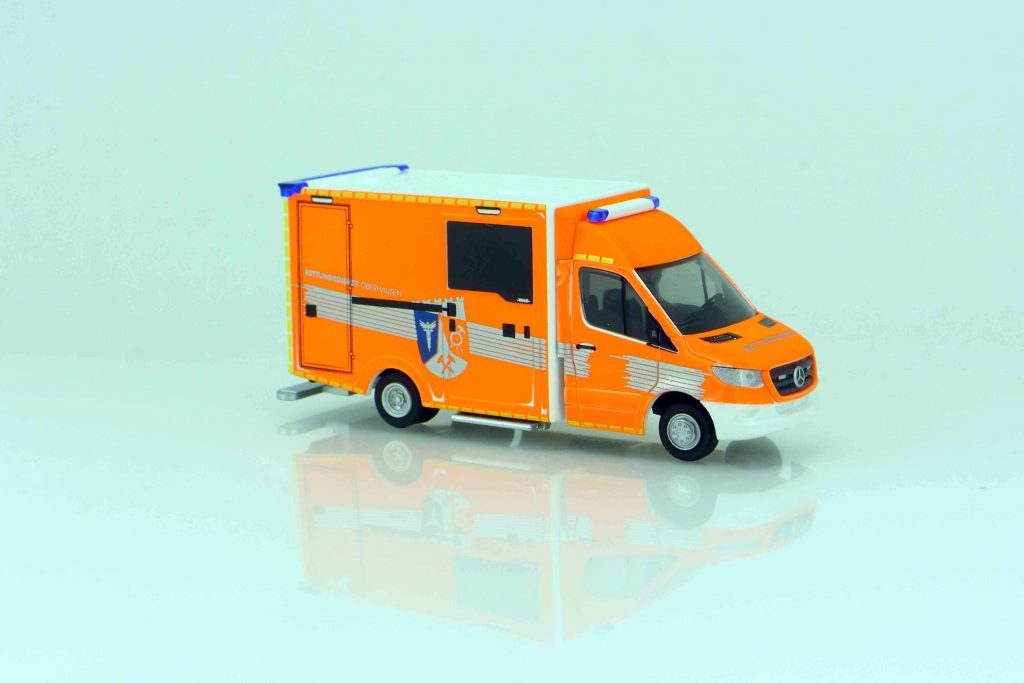 Die Feuerwehr Oberhausen erhielt vor kurzem fünf neue Rettungswagen nach dem neuen Design- und Sicherheitskonzept. Die Mercedes Sprinter bekamen Aufbauten der Wietmarscher Ambulanz- und Sonderfahrzeug GmbH (WAS), genauer gesagt vom polnischen Hersteller BAUS, der allerdings im September 2025 von WAS übernommen wurde. Das Vorbild erhielt eine tagesleuchtrote Flächenfolierung mit gelben Akzenten. Am Heck findet sich eine rot-gelbe Warnschraffur. Dies alles hat Rietze sehr schön ins Modell übertragen.