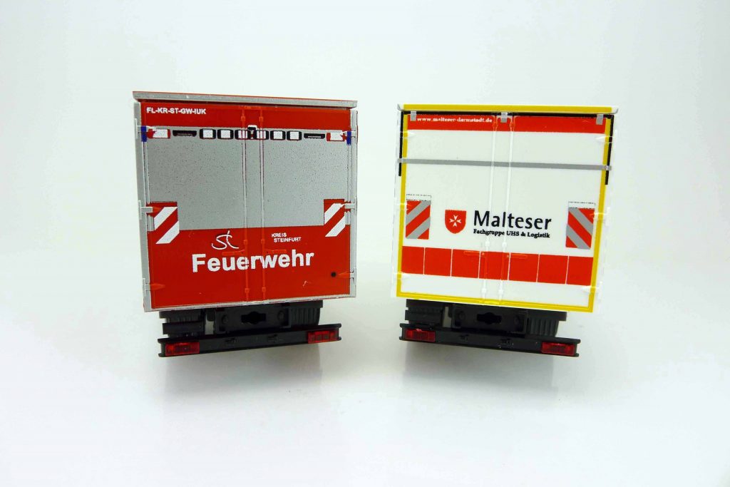 Jetzt wird es ein bisschen größer, denn es folgen zwei Gerätewagen auf der Basis des Mercedes Atego 918 F. Das erste Modell zeichnet einen Gerätewagen-Logistik (GW-L1) des Malteser Hilfsdienstes Diözese Mainz/Darmstadt-Dieburg nach, welcher der Fachgruppe UHS und Logistik zugeordnet und bei der Leitstelle stationiert ist. Der Aufbau stammt von Büchner Sonderfahrzeugtechnik. Auch die Feuerwehrtechnische Zentrale des Kreises Steinfurt in Nordrhein-Westfalen setzt einen Mercedes Atego als Gerätewagen ein und klassifiziert ihn als „Gerätewagen-Logistik/Nachschub“, unser zweites Modell. Diesmal ist das Fahrgestell ein 1224 L (Euro 6), das einen Aufbau von Hensel erhalten hat. Rietze hat beide Miniaturen mit allen Beschriftungen der Originalfahrzeuge versehen.