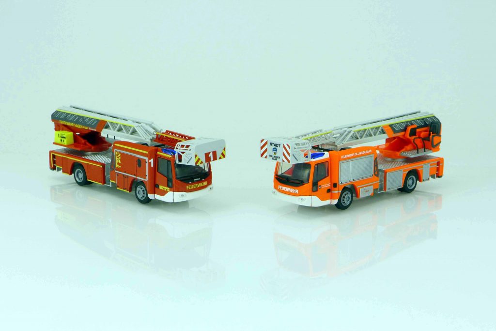 Rietze 71116 Magirus M32L-AT NB Feuerwehr-Drehleiter „Freiwillige Feuerwehr Dillingen/Saar“. FH und Aufbau leuchtrot. Leiterpark hellgrau. Trittflächen und Rollläden silbern. Zwei blautransparente Warnlichter. Beiliegende Zurüstteile. 71115 dito „Feuerwehr Hagen“. FH und Aufbau mit Rollläden rot. UVP jeweils 39,90 €.