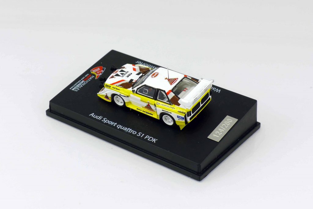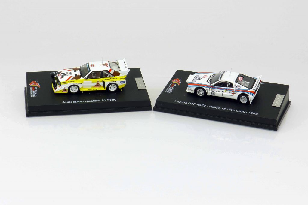 Spark 87NAM002 Audi Sport Quattro S1 PDK 1985, Karosserie weiß mit gelben Streifen „HB“. Kennzeichen „IN-YA 81“. 87 NAM 003 Lancia Rallye 037 Monte Carlo „Martini“ 1983. Startnummer „1“. Kennzeichen „TO-Y63865“. Karosserie weiß mit Martini Streifen. Resine-Fertigmodelle. Auflage je 200 Stück. Preis im Museum jeweils 39,99 €. Ausverkauft.