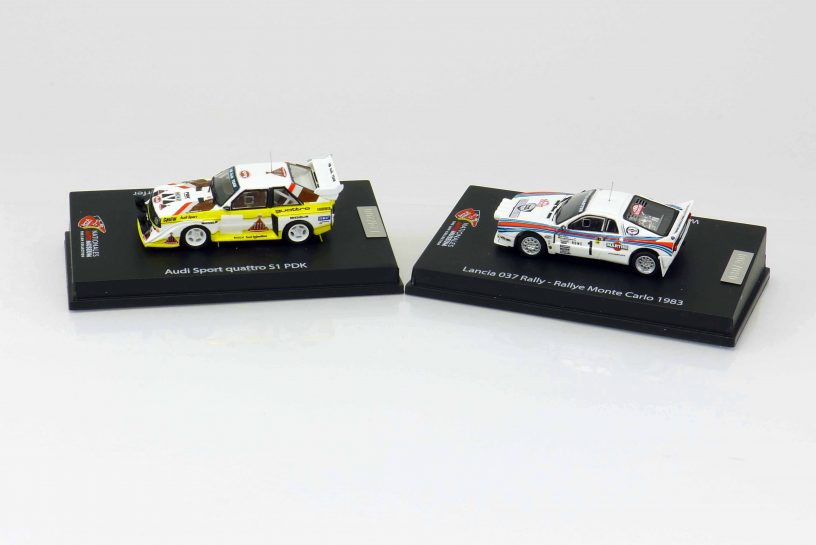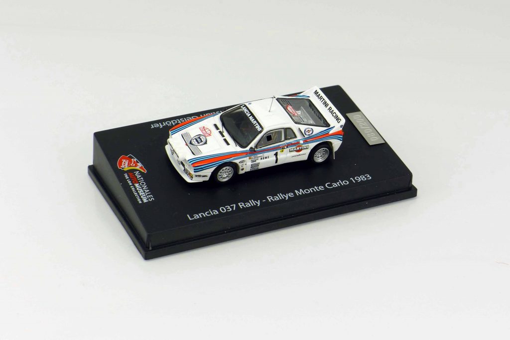 Die zweite Miniatur zeichnet ebenfalls ein legendäres Rallyefahrzeug nach, den Lancia Rally 037, auch in der Gruppe B beheimatet. Obwohl nur mit Heckantrieb ausgestattet, sicherte Walter Röhl bei der Rallye Monte Carlo 1983 durch seinen Sieg Lancia den Hersteller-Weltmeistertitel. Röhrl gewann mit seinem Co-Piloten Christian Geistdörfer elf Wertungsprüfungen und siegte ungefähr sieben Minuten vor den Zweitplatzierten Markku Alén/Ilkka Kivimaki, ebenfalls auf Lancia. Das Rallyefahrzeug basierte auf dem Lancia Montecarlo, von dem aber nur die Mittelpartie Verwendung fand. Der Mittelmotor leistete 310 PS, der eine Beschleunigung von null auf hundert in vier Sekunden möglich machte. Einschließlich der Straßenversionen des Lancia Rally 037 baute Lancia in Zusammenarbeit mit Pininfarina und Abarth 257 Einheiten.
