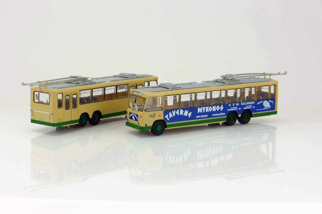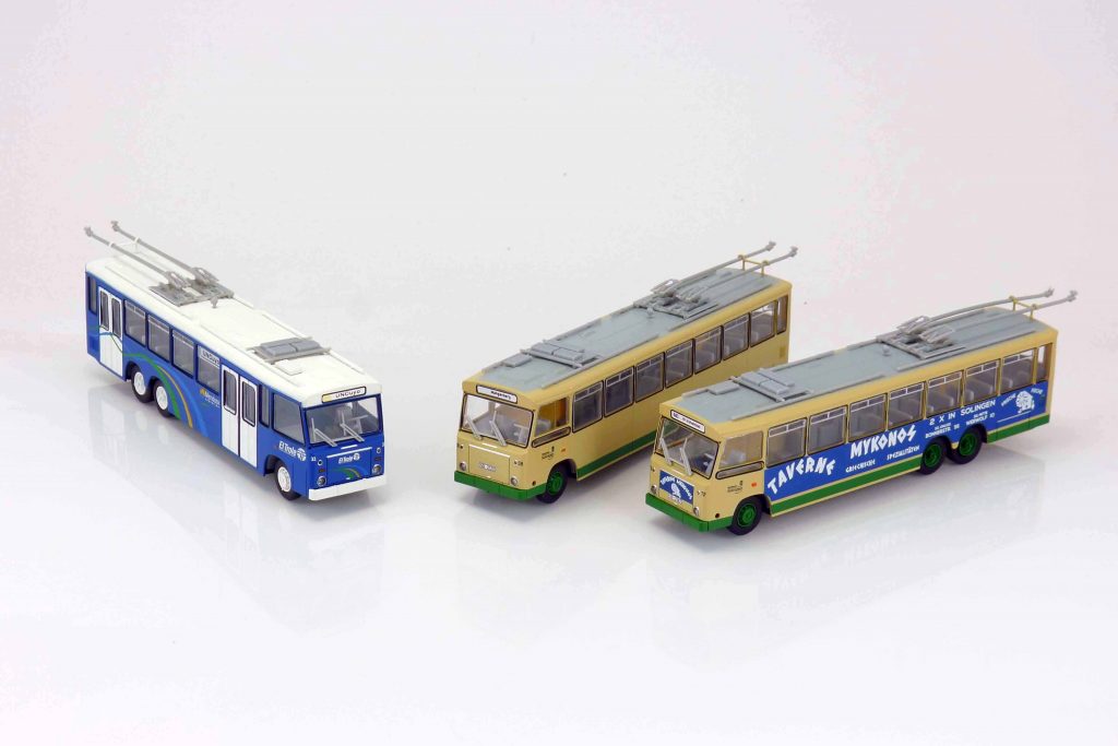 VK-Modelle 40038 Trolleybus Solingen TS3 (Ludewig) „Stadtwerke Solingen“ 1968. Aufbau elfenbein mit grünen Streifen. Dach und IA grau. Felgen grün. Wagennummer 38. Linie „Graf-Wilhelm-Platz – Mangenberg“. Kennzeichen „SG-2120“. 40072 dito mit Werbung „Taverne Mykonos“. Wagennummer 72. Linie „683 Graf-Wilhelm-Platz – Gräfrath – W-Vohwinkel“. 40132 dito „El Trole Mendoza“. Aufbau blau. Dach, Türen und Felgen weiß. Wagennummer 32. Linie „UNCuyo“. Beiliegend Seitenspiegel und ein Satz Stromabnehmer. UVP jeweils 45,99 €.