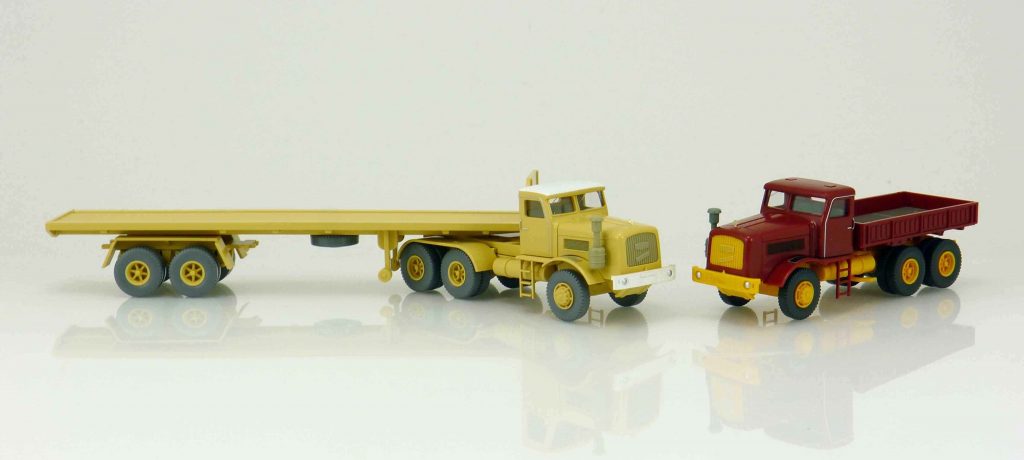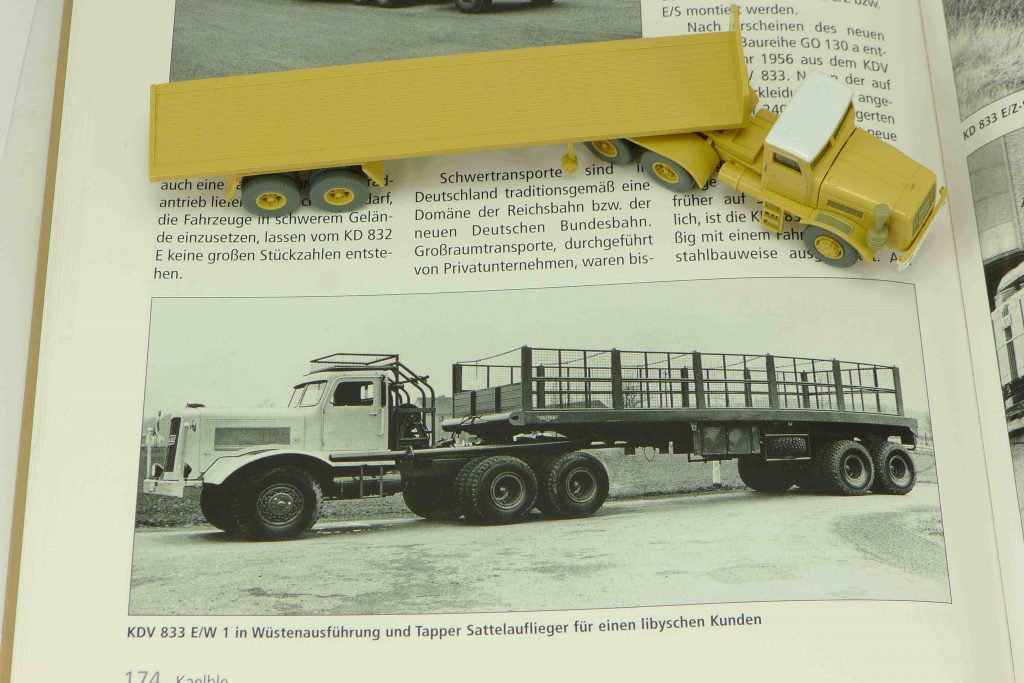Mit dem Mai- und den Juli-Neuheiten brachte Wiking zwei Modelle des Kaelble KDV 22 Z in den Handel, die Schwerlastzugmaschinen dieser Bauart nachzeichnen. Kritik bei manchen Wiking-Sammlern erntete vor allem die purpurrote Zugmaschine mit der Pritsche des MAN-Geländelastwagens, das würde nie und nimmer zusammenpassen. Das Gegenteil beweist das Titelbild des Buchs „Kaelble – Lastkraftwagen und Zugmaschinen“ aus dem Podszun-Verlag, das die Kombination eines dreiachsigen Fahrzeugs mit einer Pritsche zeigt, und genau in der Farbgebung, die Wiking auch gewählt hat (nur die Bauart der Zugmaschine ist eine andere). Kaelble versah diese Dreiachser nicht nur mit Kippmulden, sondern bot sie auch als Schwerlastzugmaschinen an. Zum imposanten Wüstensattelzug der Juli-Auslieferung findet sich im genannten Buch ein ähnliches Vorbild, das für den Einsatz in Libyen gebaut wurde.