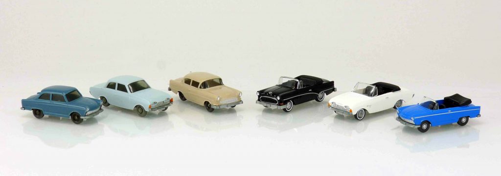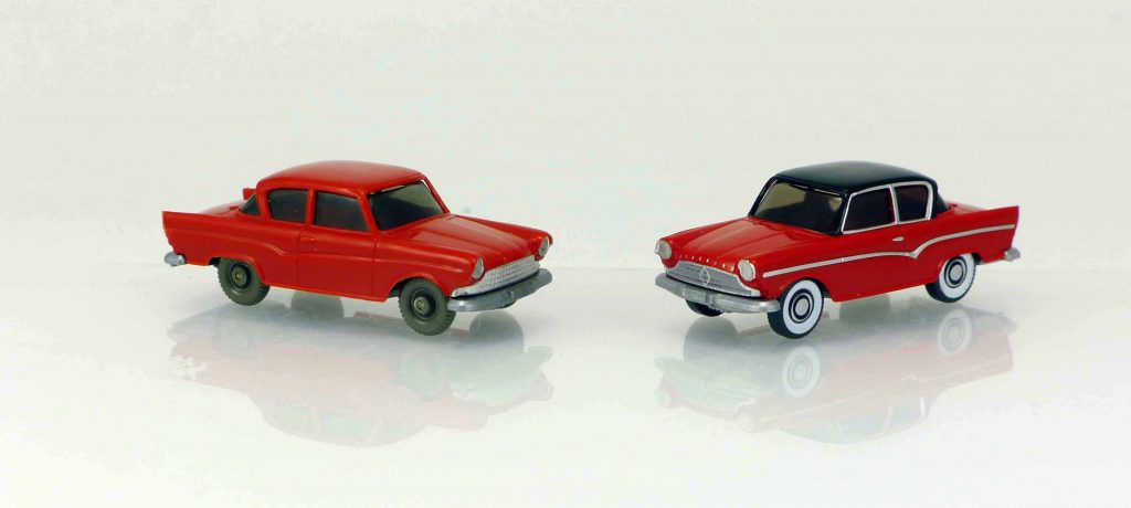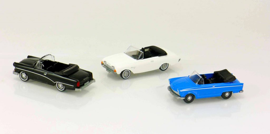 Alle drei neuen Cabriolet-Modelle sind auf die bewährte Art und Weise entstanden: ratzfatz Dach ab. Für den DKW Junior, den Ford Taunus 17m P3 und den Opel Rekord PI entwickelte Wiking neue Frontscheiben, denn im Formenbestand gibt es nichts Passendes. Die Inneneinrichtungen und Verdecke stammen allerdings von vorhandenen Miniaturen, die leider allesamt die integrierten Lenkräder aufweisen. Ein Umbau auf eingesetzte Lenkräder hätten die Verkaufspreise nochmals deutlich erhöht. Kurios wirken nur die integrierten Kopfstützen beim Ford, die gab es zur damaligen Zeit noch nicht. Um die Schnittkanten zu kaschieren, besitzen die drei Modelle einen Überzug aus Klarlack. Da von DKW erst beim Nachfolger des Junior, dem DKW F12, serienmäßig Cabriolets (hergestellt vom Karosseriebetrieb Baur) angeboten wurden, muss es sich beim Vorbild des Wiking-Modells um einen Eigenumbau handeln. Das Taunus 17m Cabriolet wurde im Original von Deutsch aus Köln umgebaut, es entstanden ungefähr 150 Fahrzeuge, die aber anders aussahen als das Wiking-Modell und 2+2-Sitzer waren. Die offene Version des Opel Rekord PI muss ebenfalls einen Eigenumbau zum Vorbild haben, denn die von Autenrieth gefertigten Fahrzeuge erhielten deutlich sichtbare Änderungen an der Karosserie (unter anderem längere Türen, optionale Heckflossen, ebenfalls 2+2-Sitzer). Statt des von uns verwendeten Wortes des „Privatumbaus“ oder „Eigenumbaus“ könnte natürlich auch das böse Wort der reinen Phantasie stehen, dem Kompromiss zwischen Anspruch und Wirklichkeit oder dem Willen, es sich leicht zu machen. Das sollte jedem Wiking-Sammler klar sein. Dennoch stellt das Trio eine interessante Bereicherung der Sammlung dar.