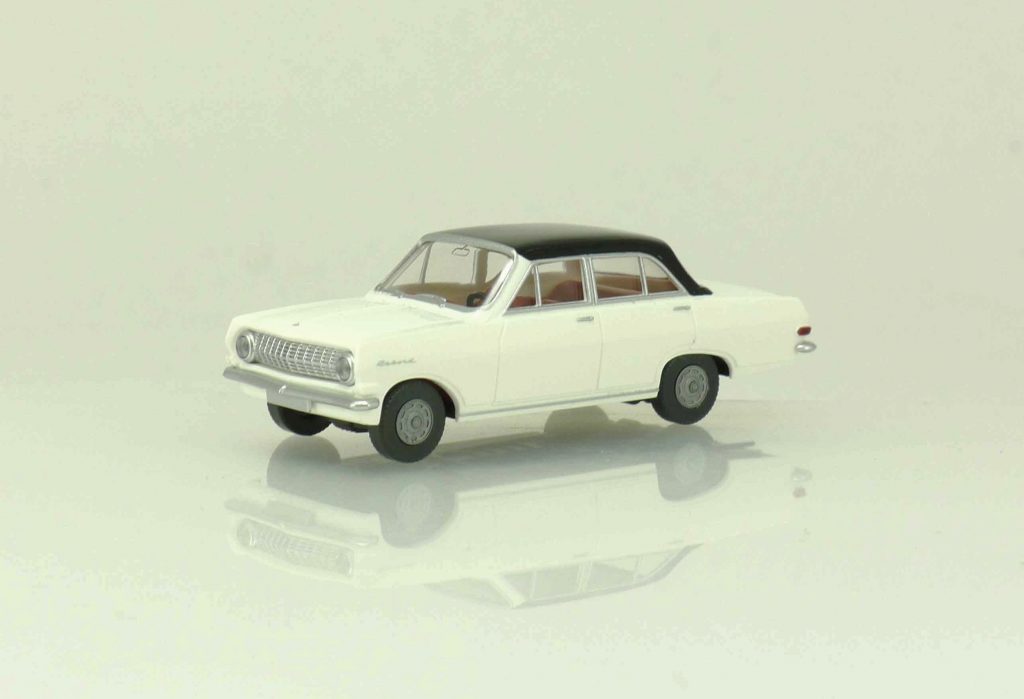 0847 06 Opel Rekord A 1963. Karosserie weiß mit schwarzem Dach. IA signalrot. FG und Lenkrad schwarz. Stoßstangen und Kühlergrill silbern. UVP 19,99 €.