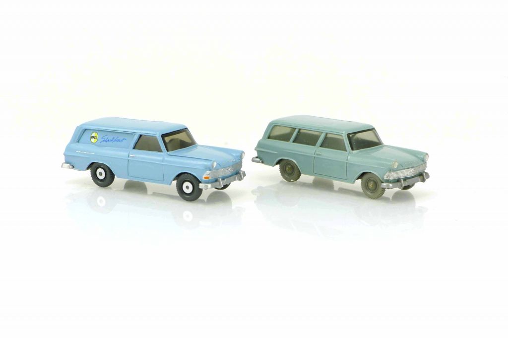 0071 46 Opel Rekord 1960 Caravan Werkstattwagen „Opel Schnelldienst“. Karosserie pastellblau. Hintere Scheiben pastellblau bedruckt. IA silbergrau. Verglasung getönt. FG und Felgen silbern. UVP 17,49 €.