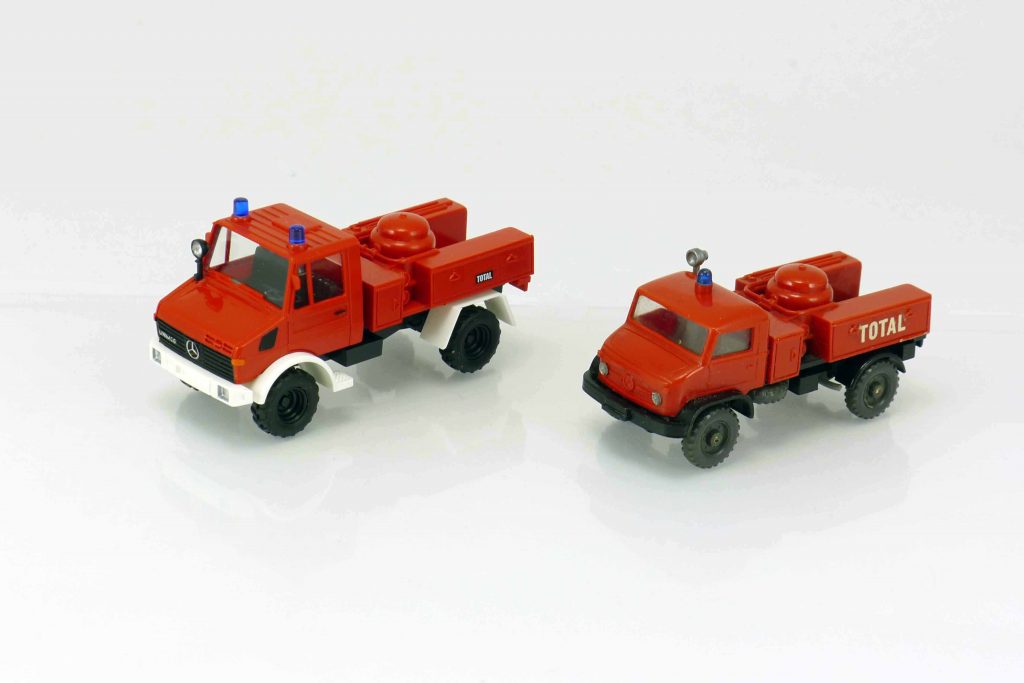 0604 03 Unimog U 1700 Feuerwehr-Pulverlöschfahrzeug „Total“ 1975. FH und Aufbau karminrot. IA, FG, Felgen, Kühlergrill und Suchscheinwerfer schwarz. Stoßstange und Kotflügel weiß. Zwei blautransparente Warnleuchten. Gummireifen. UVP 21,49 €.