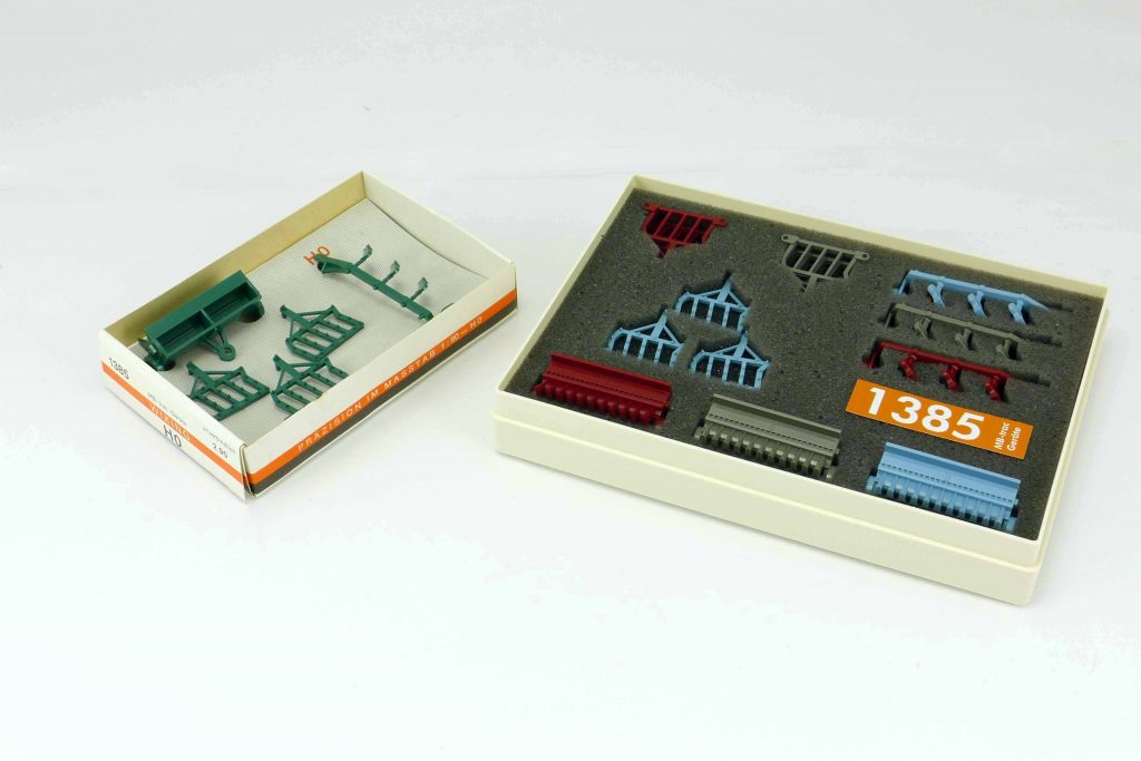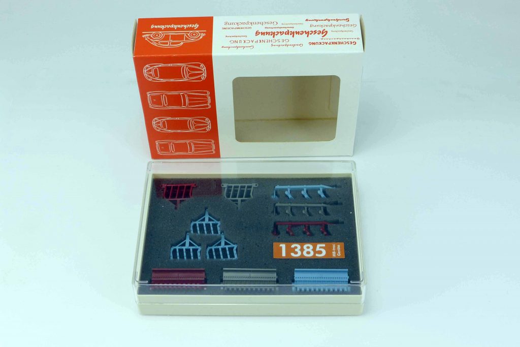 Meist zur Ankündigung der monatlichen Wiking-Neuheiten bietet Michi Bloeßl eigene Zusammenstellungen von Wiking-Modelle mit unterschiedlichen Themen und in kleinen (und manchmal sehr kleinen) Auflagehöhen an. Eine aktuelle Geschenkpackung beinhaltet Restbestände von Anbaugeräten für den MB-trac, die Michi Bloeßl bei Wiking als Ladegut hat produzieren lassen. In der papyrusweißen Plastikbox befinden sich drei Sätze der Anbaugeräte in unterschiedlichen Farben. Erinnern soll das Ganze an die historische Zubehörpackung mit der Artikelnummer 1385, die einen Satz patinagrüner Anbaugeräte, verpackt in einer N-Spur-Schachtel, enthielt. Später gab es die Teile in Resedagrün im PVC-Beutel. Angeboten wurde das Zubehörset von 1979 bis 1984.