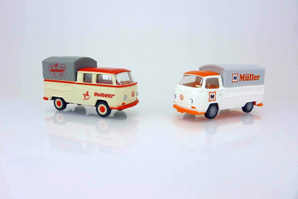 Nach dem VW T1a im „Obletter“-Design folgt jetzt eine VW T2 Doppelkabine in gleicher Gestaltung. Allerdings weist der Aufdruck auf der Plane auf ein besonderes Ereignis hin, das 200-jährige Jubiläum des Spielzeuggeschäfts, das im Jahr 1825 von Josef Obletter in München gegründet wurde. Das erste Geschäft hatte seinen Sitz zunächst am Marienplatz, später am Karlsplatz (Stachus). In den 70er Jahren erfolgte der Verkauf an Franz Carl Weber aus Zürich. Aufgrund von finanziellen Schwierigkeiten verkaufte Franz Carl Weber einige der 30 Filialen, andere wurden geschlossen. Einen kleinen Teil, darunter auch das Geschäft am Stachus, übernahm 1997 die Drogeriemarktkette Müller aus Ulm. Zunächst hieß es, das Obletter-Modell könne nur direkt im Hauptgeschäft in München erworben werden, aber kurze Zeit später kam die Nachricht, dass auch der Onlineverkauf über Müller möglich ist. Auch kann man sich das Sondermodell an eine Filiale in der Nähe liefern lassen. Kurz nach Bekanntwerden des Obletter-Modells präsentierte Müller auch ein Wiking-Sondermodell mit Müller-Eigenwerbung, mittlerweile das sechste. Müller begnügt sich mit einem Pritschenwagen mit Einfachkabine, der mit dem aktuellen Schriftzug und Logo bedruckt ist. Auch dieses Modell kann in Müller-Filialen gekauft oder online bestellt werden.