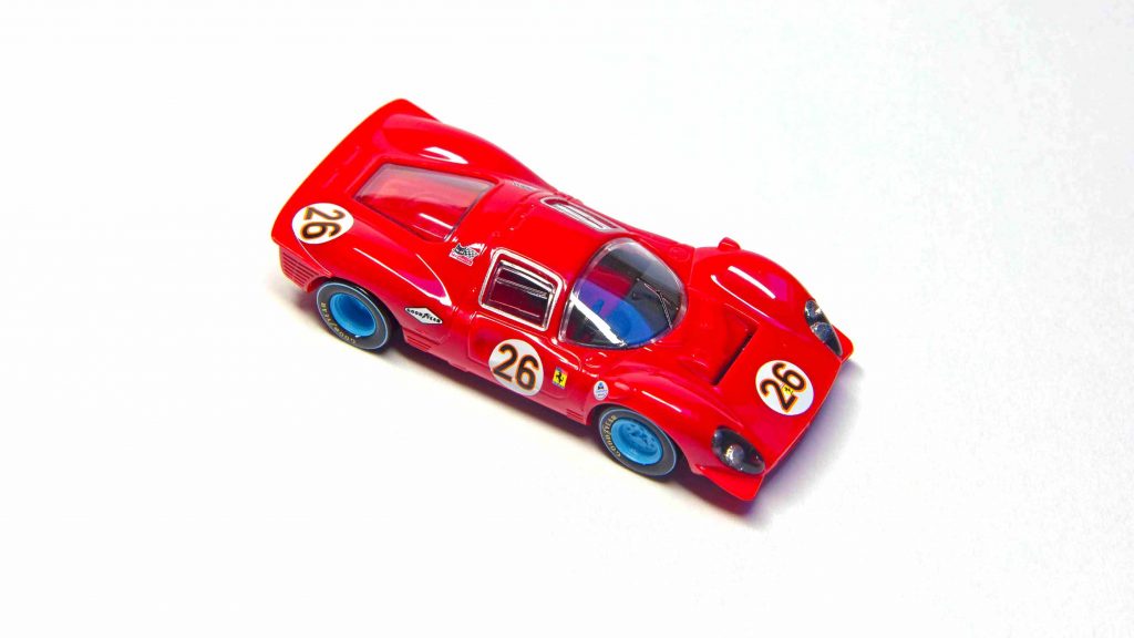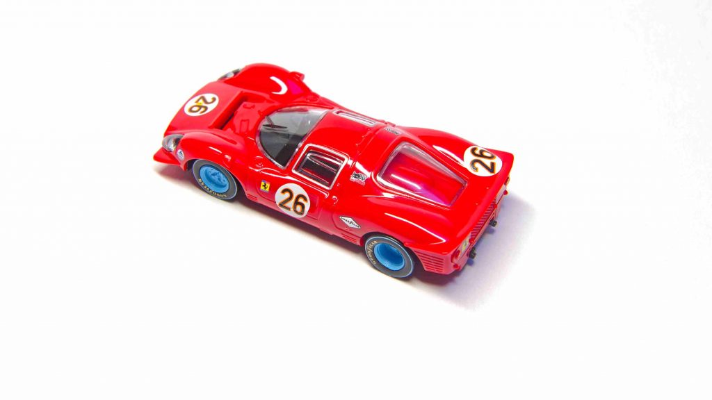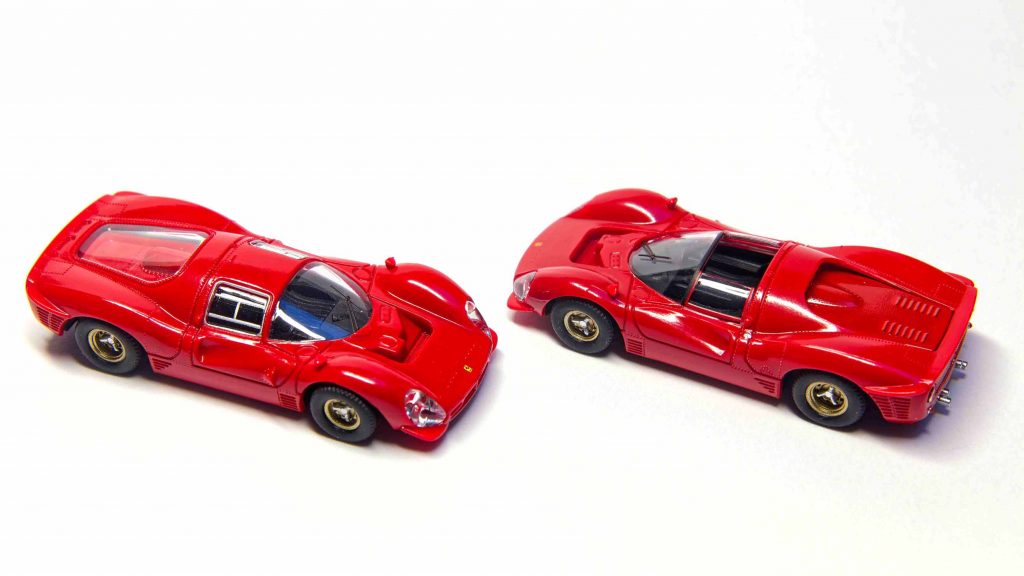 Last, but not least: Der Carbone87-Ferrari. Die Modelle des Ferrari 330 P4 von Carbone wurden als Berlinetta und als Spider in der zweiten Hälfte der 90er Jahre produziert und sind nur selten im Angebot. Die Modelle entsprechen dem sehr guten Formenbau ihrer Zeit im angenäherten H0-Maßstab, fallen jedoch mit ca. 1:84 etwas größer aus. Die Modelle sind in einer sehr guten Form- und Detailqualität sowie Bedruckung ausgeführt. Die typischen Merkmale des 330 P4 am Heck und an der Front sowie die Unterschiede zwischen der Berlinetta und dem Spider wurden präzise herausgearbeitet. Die Berlinetta entspricht der Version von Le Mans 1967, der Spider dem Umbau zum nachfolgenden Rennen in Brands Hatch 1967. Die Außenspiegel wurden bei der Berlinetta vorbildgerecht in die Kotflügel integriert und beim Spider richtigerweise weggelassen. Carbone hat den Spider nicht mit den passenden Startnummern bedruckt, sondern die Startnummern des 330 P3/4 aus dem Rennen in Daytona im Frühjahr 1967 verwendet. Das ist angesichts der hochwertigen und raren Ausführung zu verschmerzen.